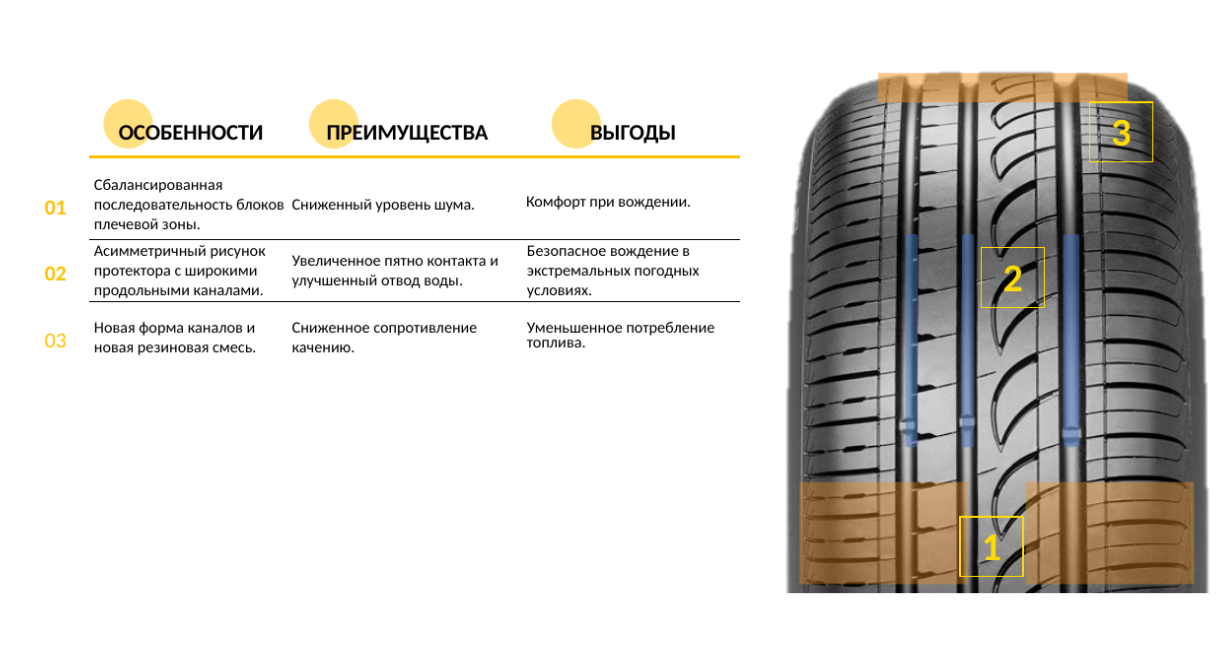 - Широкие блоки плечевых зон дают шине хорошую устойчивость при перестроении и совершении манёвров на высокой скорости.