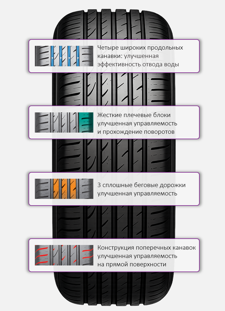 - Четыре широкие продольные канавки: улучшают отвод воды, снижая риск аквапланирования.